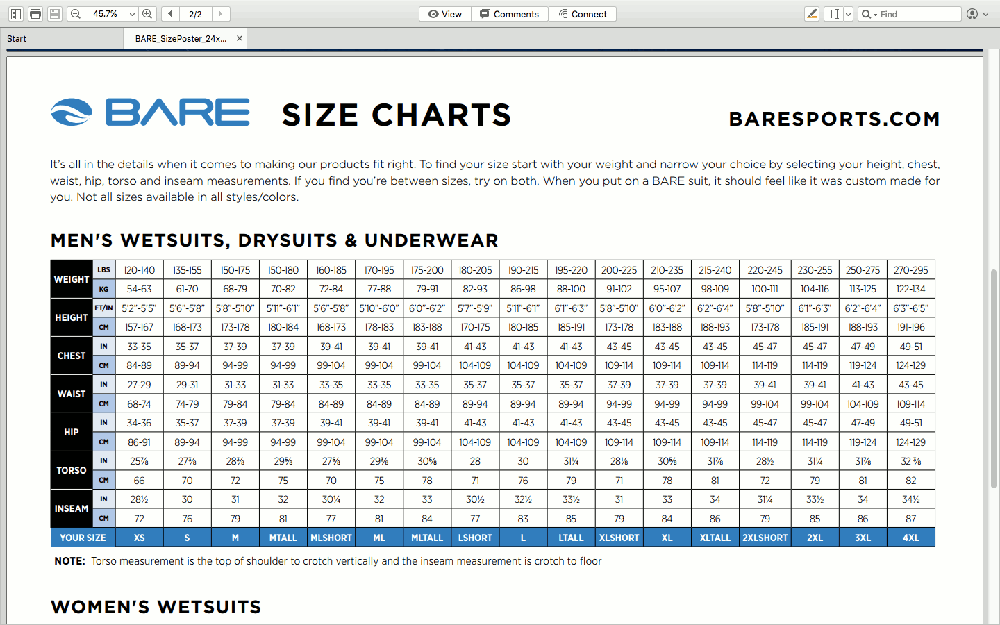 Костюмы Bare не "маломерки" вполне можно верить таблице размеров. Таблицу прилагаю.Evgen1960 писал(а):Знакомый попросил помочь с гидриком 5 мм. Нужен костюм на фигуру пингвина нашего 54-56 размера роста 178. Присмотрел ему BARE Velocity 5 mm у амеров, есть все размеры и цвета, а размерная линейка у них очень богатая, один размер по меркам подходит идеально. Кто имел дело с BARE, важно знать соответствие их размеров реальным тушкам. Спасибо.