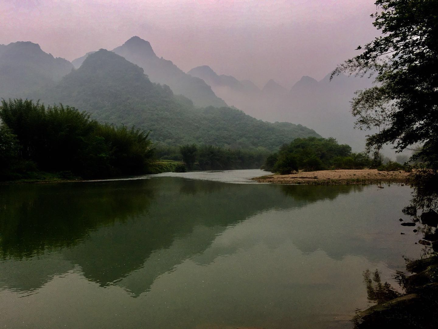 Закончив ознакомительный осмотр трёх пещер южной группы, и пообедав в Яншане, можно двинуться на север для осмотра группы пещер, расположенной в этом направлении. Ехать от 30 до 50 минут по красивой горной дороге. Немного попетляв, дорога приводит в долину реки, зажатой между высокими грядами, сплошь заросшими влажным лесом, гор. Наш сюда визит состоялся при таких погодных условиях, когда горы были укрыты облаками тумана. Причем местами эти облака были густыми, местами их не было вообще. Зрелище потрясающее. На ум сразу приходит эпитет «мглистые» горы, по аналогии с фильмами о хоббитах, а глядя через реку на массив горы можно представить гномов, чахнущих над своими сокровищами где-то там, глубоко внутри. Ну или дракона Смауга, например. Хотя Смауг сидел в отдельно стоящей горе, так что пример не годится.